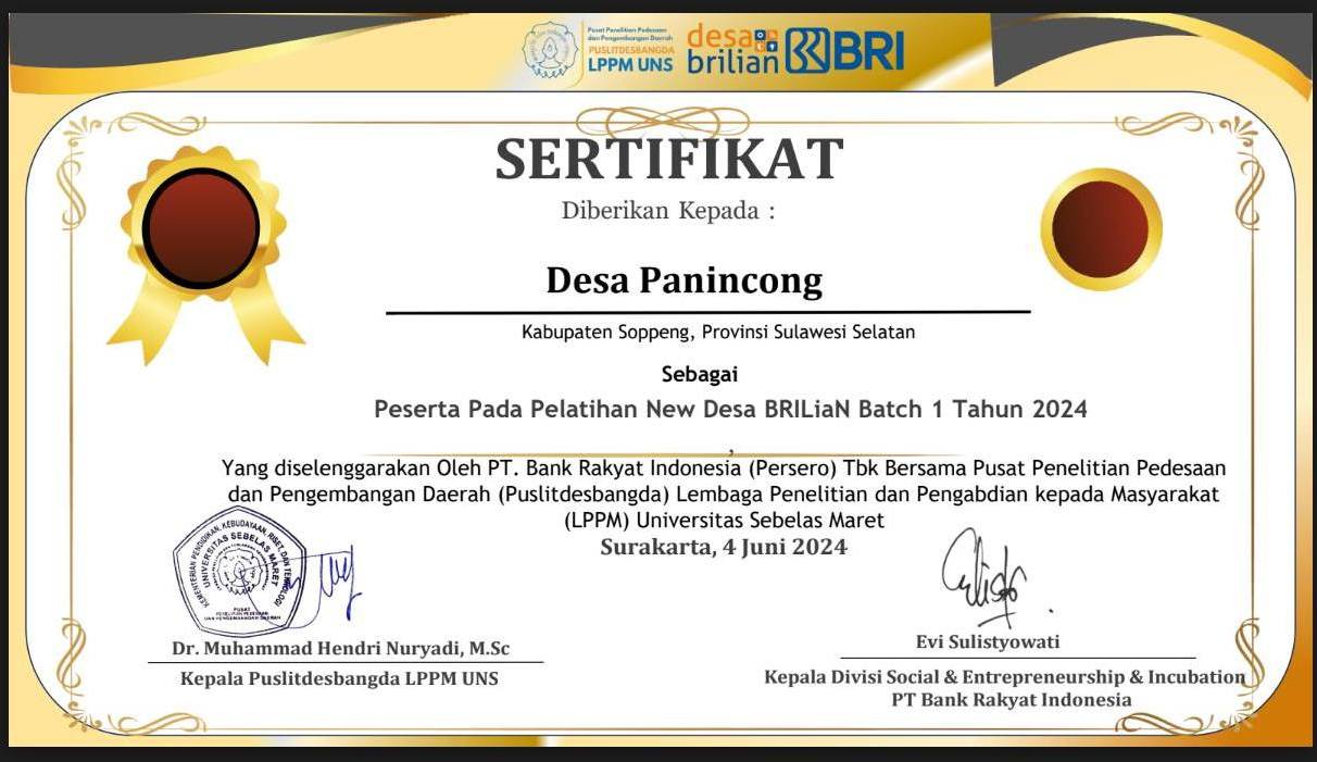 Setelah berhasil mendapatkan gelar Desa Brilian, Panincong pun masuk dalam Kategori Desa Terbaik 40 yang diganjar dengan mendapatkan hadiah uang dari BRI sebesar Rp. 10.000.000,-
