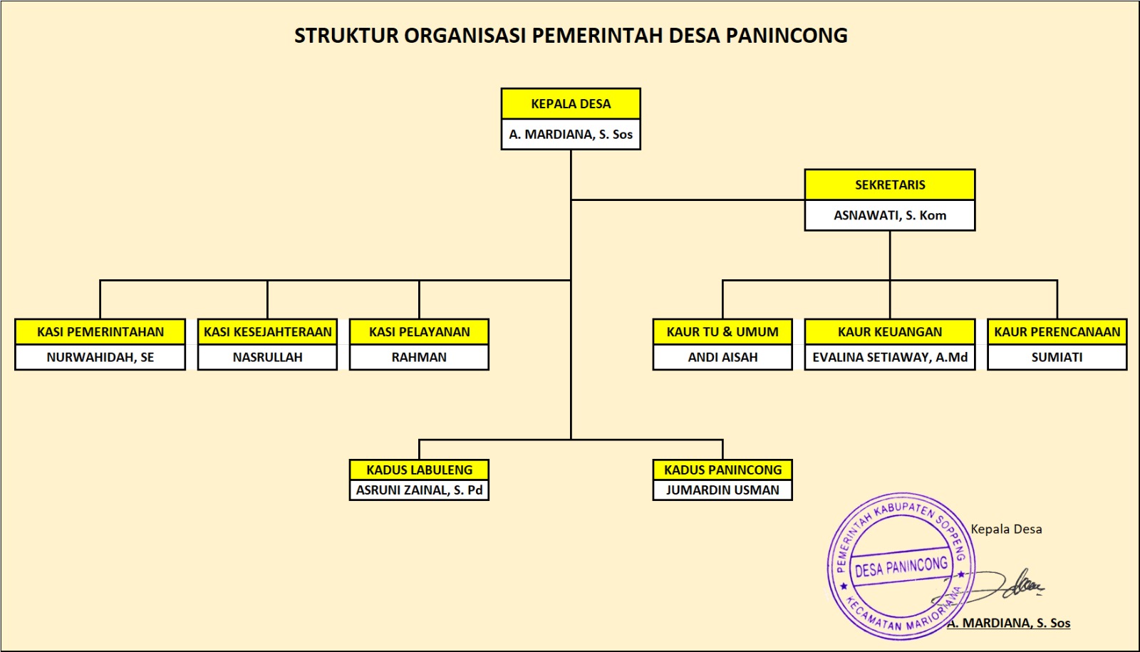 1 | ANDI MARDIANA, S. Sos | KEPALA DESA | 766/XII/2018 264/VI/2024 (Perpanjangan Masa Jabatan Kepala Desa |